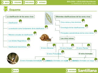 El documento describe la evolución de la clasificación de los seres vivos a través de la historia, desde las primeras clasificaciones propuestas por Linneo hasta las más modernas con cinco reinos y tres dominios. Se explican los principales métodos de clasificación como los árboles filogenéticos y la taxonomía, así como las características generales de los cinco reinos tradicionales: moneras, protoctistas, hongos, plantas y animales.