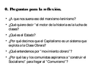 El documento resume los principales conceptos del marxismo-leninismo, incluyendo su análisis de la historia a través de la lucha de clases, la naturaleza del estado capitalista y su función de oprimir a la clase obrera, la economía capitalista y la explotación de los trabajadores, y el objetivo final del comunismo de abolir el estado y alcanzar la máxima libertad de la humanidad.