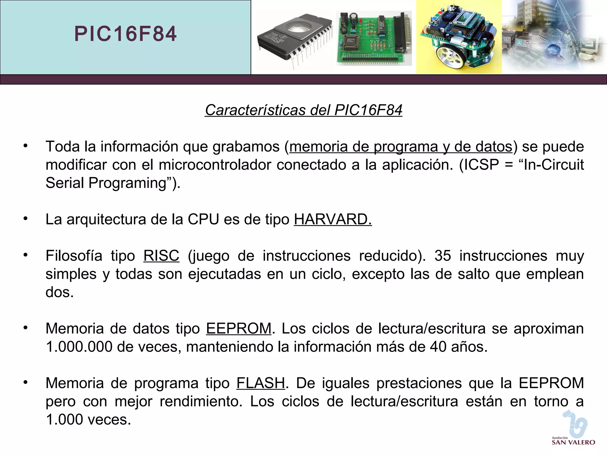 - Arquitectura Harvard con memoria de programa y datos independientes.