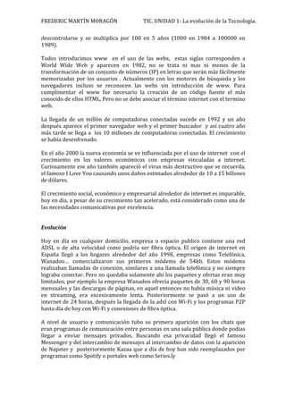 El documento describe la evolución de Internet desde sus inicios en 1969 cuando se conectaron 4 computadoras entre universidades estadounidenses hasta la actualidad. Explica cómo Internet ha pasado de ser una herramienta para compartir información a revolucionar la tecnología y la sociedad a través de avances como las redes sociales y el comercio electrónico. También analiza el impacto económico y social de Internet, incluyendo cómo ha cambiado la forma en que las personas se comunican, trabajan y reciben educación.