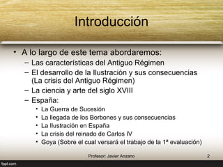 Este documento presenta una introducción a la unidad sobre el siglo de las luces. Resume las características del Antiguo Régimen y el desarrollo de la Ilustración. También aborda la ciencia y el arte del siglo XVIII, así como aspectos específicos de España como la Guerra de Sucesión, la llegada de los Borbones e Ilustración española. Finalmente, se enfoca en Goya y su trabajo para la primera evaluación.
