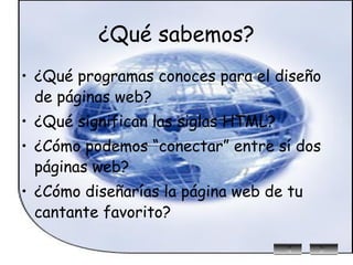 Este documento presenta una unidad didáctica sobre el diseño de páginas web. Introduce conceptos clave como HTML, etiquetas, hipervínculos e imágenes. Explica cómo crear documentos HTML y diseñar páginas web usando Microsoft FrontPage. El objetivo es enseñar a los estudiantes los fundamentos de creación y publicación de sitios web.