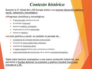 El documento describe el contexto histórico y artístico del Impresionismo en Francia durante la segunda mitad del siglo XIX. Surge como reacción contra el academicismo de la Academia de Bellas Artes y los Salones Oficiales. Los impresionistas se caracterizan por pintar al aire libre, captar la luz y sus efectos, usar colores claros y pinceladas sueltas. Algunos de los principales impresionistas fueron Monet, Pissarro, Sisley, Renoir y Degas.