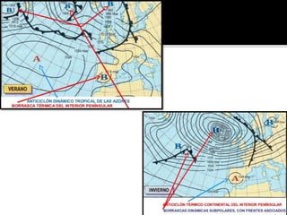 Este documento describe los factores y elementos que influyen en el clima de España. Explica que debido a una combinación de factores geográficos como la latitud, la influencia del mar y el relieve, así como factores termodinámicos como la circulación atmosférica en altura y en superficie dirigida por la corriente en chorro y los centros de acción, España presenta una gran diversidad climática. Resalta la importancia de entender estas variables para explicar los diferentes climas y tipos de tiempo del país.