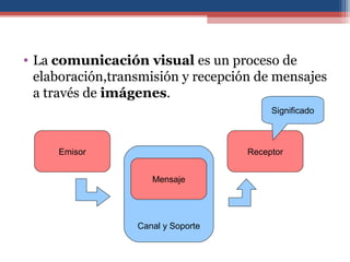 La comunicación visual es un proceso de transmisión de mensajes a través de imágenes entre un emisor y receptor. El significado del mensaje depende del contexto y está influenciado por la percepción del receptor, mientras que el significante es el contenido visual de la imagen. Las imágenes pueden tener finalidades informativas, exhortativas, recreativas, estéticas o expresivas para identificar, indicar, describir, convencer, entretener o transmitir emociones.
