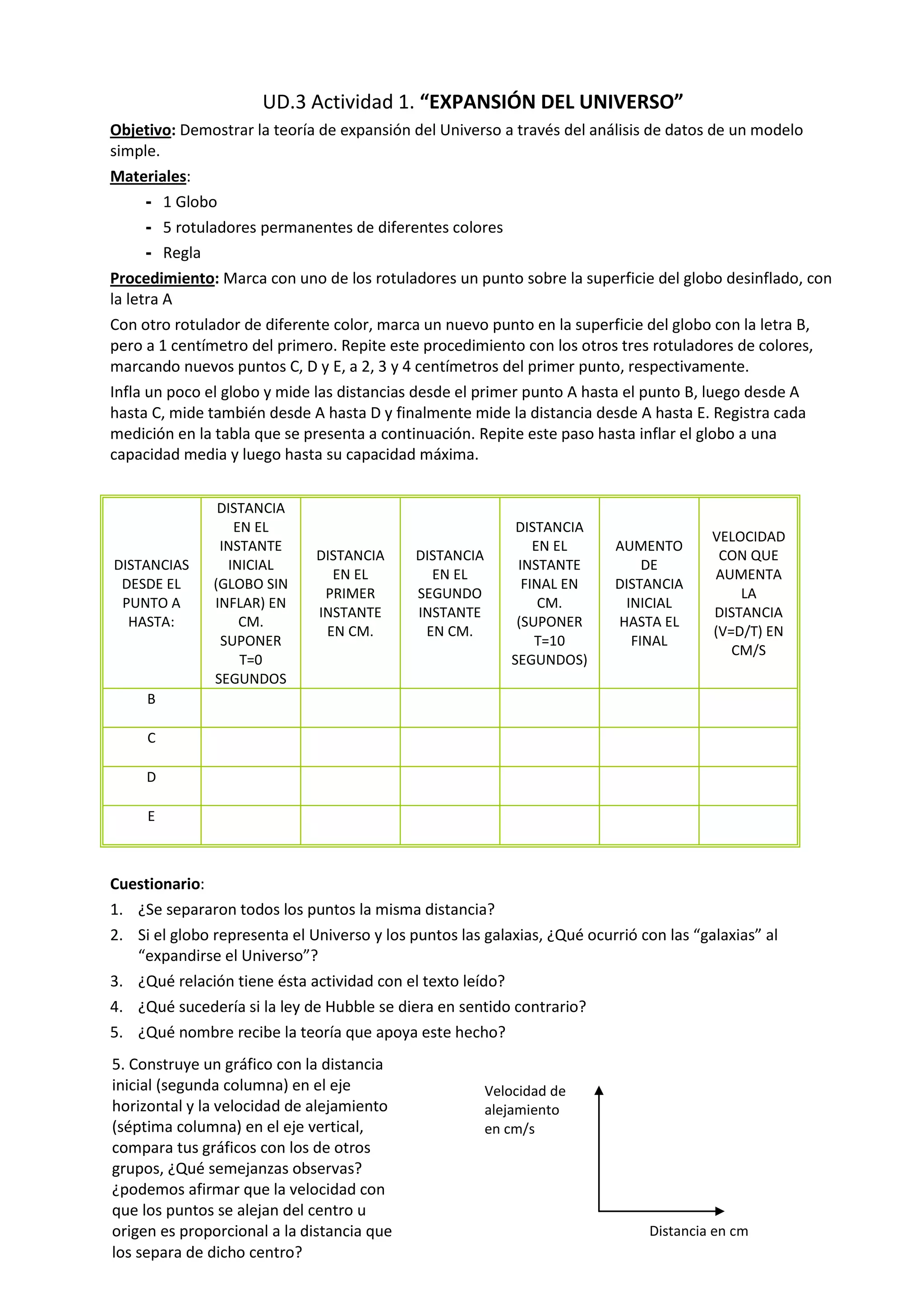 Este documento describe un experimento para demostrar la expansión del universo usando un globo. Se marcaron puntos en un globo desinflado y se midieron las distancias entre ellos a medida que se inflaba el globo. Al inflarse, las distancias entre los puntos aumentaron, simulando cómo las galaxias se separan entre sí en expansión del universo. Los resultados apoyan la teoría de que la velocidad de alejamiento de las galaxias es proporcional a su distancia, conocida como la ley de Hubble.