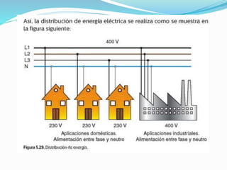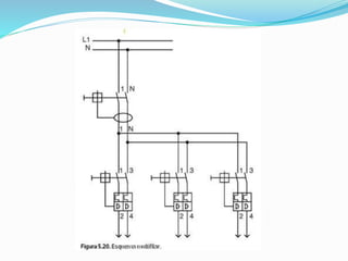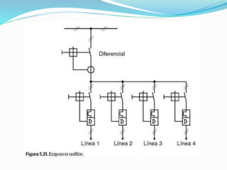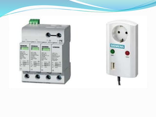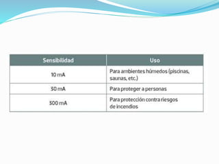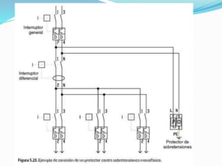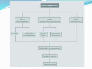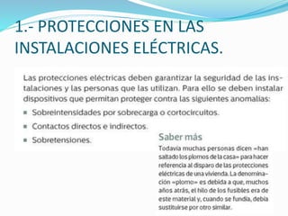 El documento describe diferentes métodos de protección en instalaciones eléctricas, incluyendo protección contra sobreintensidades mediante fusibles e interruptores magnetotérmicos, protección contra contactos directos e indirectos mediante conexión a tierra e interruptores diferenciales, y protección contra sobretensiones mediante protectores de sobretensiones. También cubre la separación de circuitos y el suministro de energía en instalaciones eléctricas.