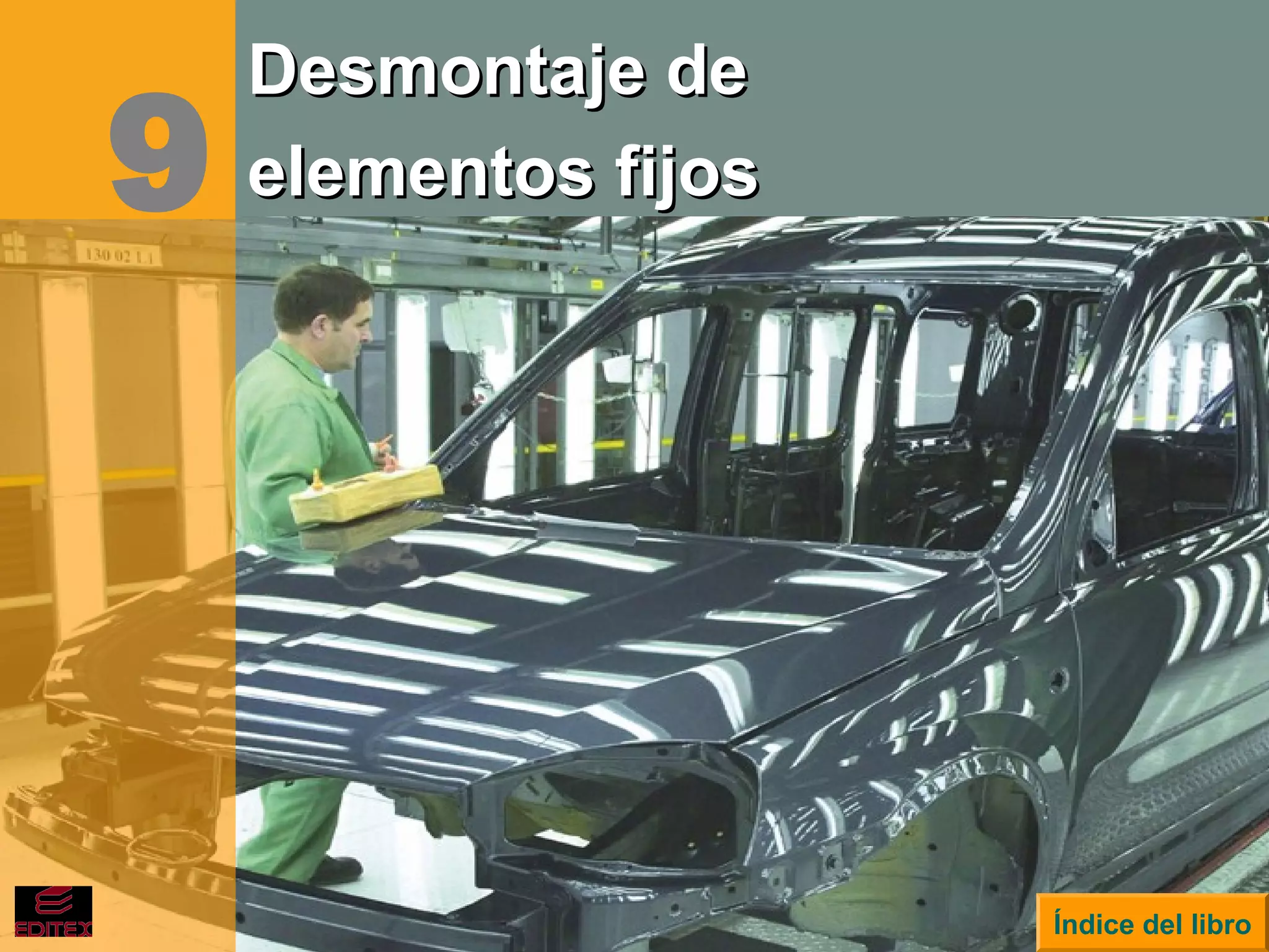 Este documento describe los diferentes procesos y herramientas utilizadas para el desmontaje de elementos fijos, incluyendo el corte, desengatillado, despuntado y separación de soldaduras. Explica procesos como el aserrado, cizallado, cincelado y corte por plasma, así como normas de seguridad. Incluye prácticas profesionales sobre despuntado de chapas y corte de chapa de carrocería.