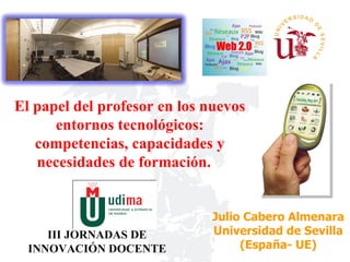 Este documento discute el papel cambiante del profesor en entornos tecnológicos modernos y las competencias y capacitaciones necesarias. Explica que los profesores deben adaptarse a nuevas concepciones del aprendizaje y características de los estudiantes. También describe varios roles potenciales de los profesores y las dimensiones clave para su formación en tecnología educativa, incluidos los conocimientos técnicos, pedagógicos y disciplinarios.