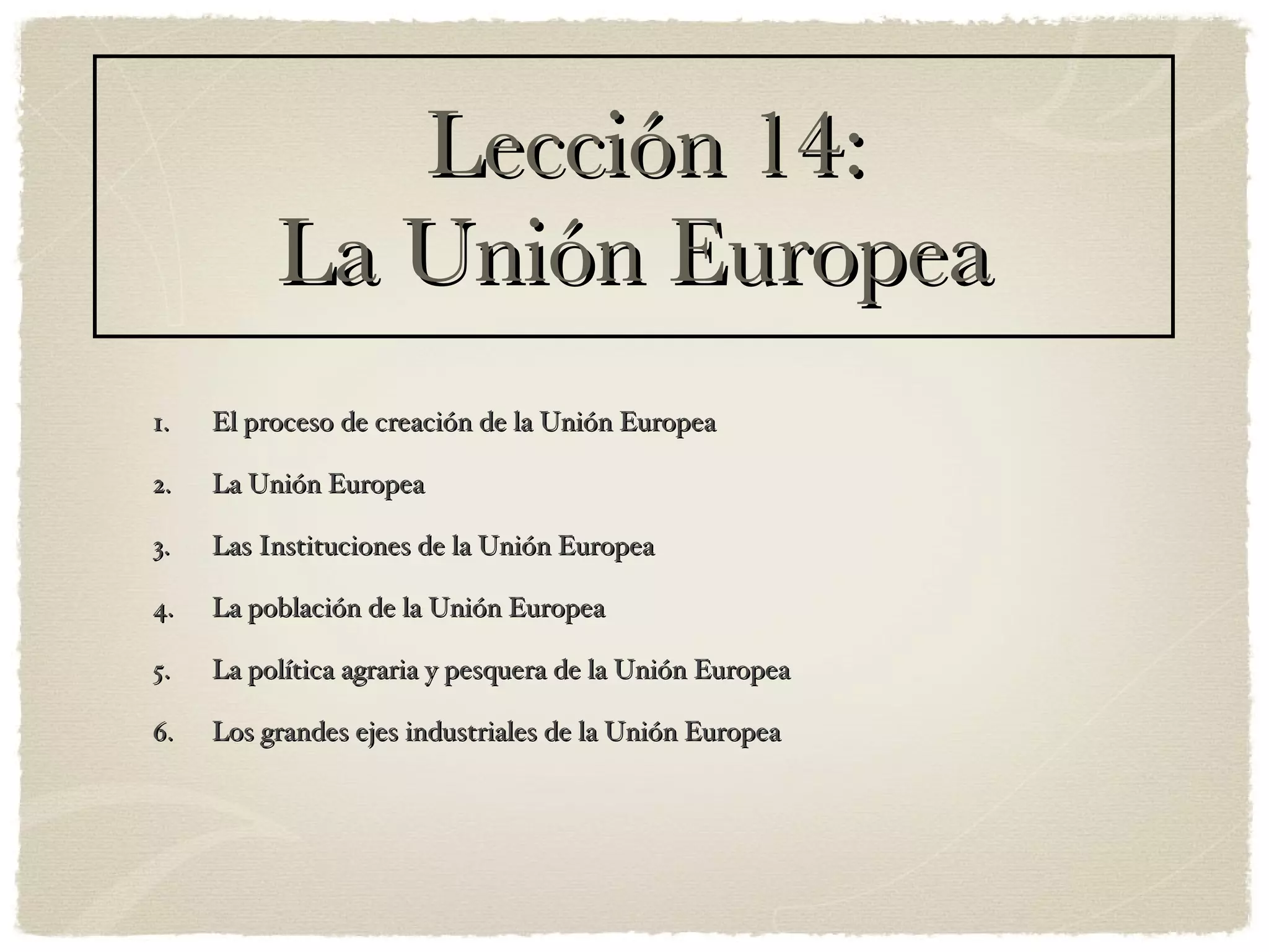 El documento proporciona una introducción general sobre la Unión Europea. Explica el proceso de creación de la UE a través de tratados clave como el Tratado de Roma de 1957 y el Tratado de Maastricht de 1992. Describe las principales instituciones de la UE como el Parlamento Europeo, el Consejo de la UE y la Comisión Europea. También resume brevemente algunas políticas clave de la UE como la política agraria, pesquera e industrial.
