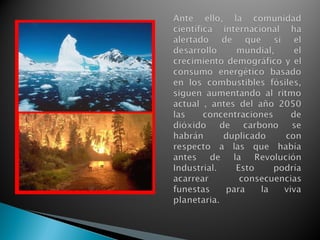 El documento describe los efectos del calentamiento global y cómo ha acelerado las variaciones climáticas de manera anómala, afectando la vida en el planeta. Explica que existe una relación directa entre el calentamiento global y el aumento de los gases de efecto invernadero emitidos principalmente por sociedades industrializadas. También analiza la atmósfera y sus capas, su composición, y el papel crucial de los gases de invernadero a pesar de estar en bajas cantidades.