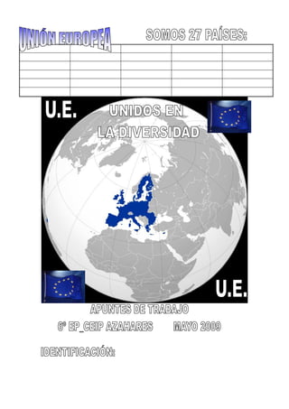 Este documento presenta un proyecto escolar sobre la Unión Europea. El proyecto busca que los estudiantes aprendan y comprendan aspectos clave sobre Europa, incluyendo cuándo y cómo se fundó la UE, qué países fueron los fundadores, cuántos y cuáles son los países miembros actuales, los símbolos de la UE, y la estructura y funcionamiento del Parlamento Europeo. Los estudiantes deberán investigar sobre un país asignado y luego explicar lo que aprendieron a sus compañeros.