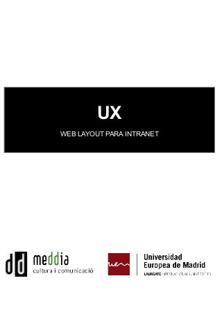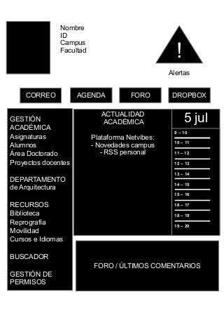 El documento describe un diseño de layout para una intranet educativa que incluye secciones sobre gestión académica, asignaturas, áreas de doctorado y recursos docentes. También detalla foros, calendarios, alertas y características de comunicación interna para facilitar el seguimiento académico. Además, se menciona la gestión de permisos y recursos disponibles para alumnos y docentes en el departamento de arquitectura.