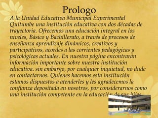 La Unidad Educativa Municipal Experimental Quitumbe es una institución educativa en Quito, Ecuador que ofrece educación integral en los niveles básico y bachillerato a través de procesos de enseñanza dinámicos, creativos y participativos. Fue fundada en 1992 y actualmente atiende a 1463 estudiantes distribuidos en jornada matutina en los niveles básico y bachillerato. También ofrece actividades extracurriculares en el horario vespertino para la formación integral de los estudiantes a través de actividades rel