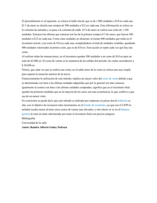 El documento describe el método de últimas en entrar primeras en salir (UEPS) para valuar inventarios. Con este método, los productos más recientemente comprados se venden primero, dejando los productos comprados inicialmente en el inventario final. Este método es útil cuando los precios aumentan constantemente. El documento también incluye un ejemplo numérico para ilustrar cómo aplicar el método UEPS.