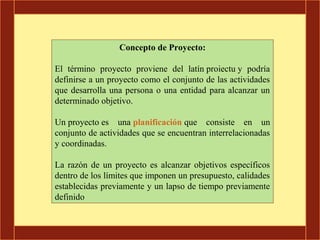 El documento describe diferentes tipos de proyectos, incluyendo proyectos de inversión, negocios, educación, ONG, gobierno, sociales, políticos e infraestructura. Define cada tipo de proyecto y proporciona ejemplos. Los proyectos se pueden clasificar de acuerdo a su sector, naturaleza, objetivo u otros factores.