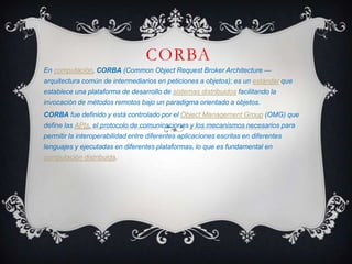 CORBA es un estándar que permite la invocación remota de métodos bajo un paradigma orientado a objetos, facilitando el desarrollo de sistemas distribuidos. Define las APIs, protocolos y mecanismos necesarios para la interoperabilidad entre aplicaciones escritas en diferentes lenguajes y plataformas. WCF es un marco de Microsoft para crear aplicaciones orientadas a servicios mediante el intercambio de mensajes entre extremos de servicio de forma asincrónica. Proporciona características como orientación a servicios, interoperabilidad, diferentes mode