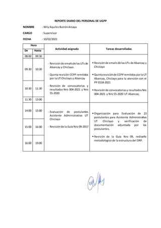 El supervisor WilyAquilesButrónArcaya revisó correos electrónicos y documentos de las unidades técnicas de Abancay y Chiclayo, evaluó postulantes para un puesto en la unidad técnica de Chiclayo, y revisó guías y convocatorias durante su jornada laboral del 10 de febrero de 2021.