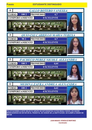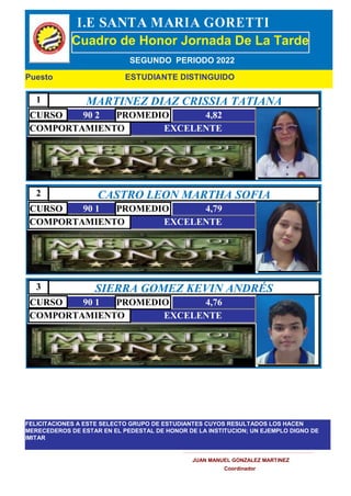 Este documento presenta el cuadro de honor de la jornada de la tarde del segundo período de 2022 en la escuela Santa María Goretti. Se enumeran los nombres de los estudiantes destacados con sus calificaciones y puestos. El coordinador Juan Manuel González Martínez felicita a estos estudiantes por sus logros académicos y de comportamiento, sirviendo de ejemplo a seguir para los demás.