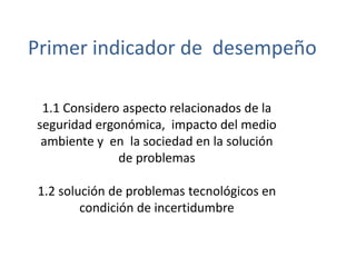 Este documento presenta un resumen de desempeño de Fabio Moreno y William Céspedes. El primer indicador de desempeño considera aspectos relacionados con la seguridad ergonómica, el impacto ambiental y social al solucionar problemas. También aborda la solución de problemas tecnológicos bajo condiciones de incertidumbre. Además, define la ergonomía como la disciplina tecnológica que diseña lugares de trabajo, herramientas y tareas acordes a las características fisiológic