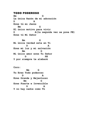 El documento contiene las letras de varias canciones cristianas que alaban a Dios por sus milagros, su poder y su amor. Las canciones describen a Dios como incomparable, todopoderoso, la única razón de adoración y la única verdad. Celebran que Dios sana, salva y brilla en la oscuridad.