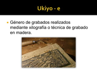 El ukiyo-e fue la primera forma artística popular en Japón, desarrollándose desde el periodo Edo hasta el periodo Meiji. Era un grabado en madera que retrataba temas como la vida urbana, cortesanas, paisajes y actores populares. Aunque temas políticos y de las clases bajas estaban prohibidos, el sexo a veces aparecía. El proceso involucraba al artista dibujando en una plancha de madera y artesanos imprimiendo con tintas de colores diferentes para crear la imagen final.