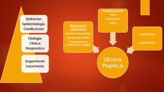 La ulcera péptica es una lesión crónica que puede aparecer en el esófago, estómago o duodeno. Se define como una lesión que penetra más allá de la capa muscular de la mucosa. Las principales causas son la infección por Helicobacter pylori y el consumo de AINES. El tratamiento de elección para H. pylori es un esquema triple con antibióticos. Las ulceras también pueden ser refractarias o estar asociadas a estrés en pacientes graves.