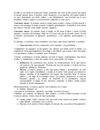 1) El documento describe la anatomía del estómago, incluyendo su ubicación, tamaño, partes y capas. 2) Explica factores como la infección por Helicobacter pylori y el uso de AINE que pueden dañar la mucosa gástrica y causar úlcera péptica. 3) La úlcera péptica resulta de un desequilibrio entre factores agresivos como la secreción ácida y factores protectores de la mucosa.