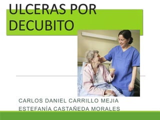 Las úlceras por decúbito son lesiones de la piel y tejidos blandos subyacentes causadas por la presión prolongada. Generalmente ocurren en áreas como la pelvis y regiones sacras. Su tratamiento incluye prevención, control de infección, alivio de presión, desbridamiento y apósitos. En casos graves se requiere cirugía para extirpar tejidos dañados y cubrir la herida.