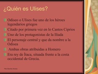 Ulises fue un legendario héroe griego, rey de Ítaca. Participó en la guerra de Troya donde tuvo un papel decisivo al idear el caballo de Troya. Tras la guerra, intentó regresar a Ítaca pero sufrió una odisea de 10 años enfrentando monstruos y peligros enviados por Poseidón debido a que cegó al cíclope Polifemo. Finalmente regresó disfrazado y vengó la profanación de su casa matando a los pretendientes de su esposa Penélope.
