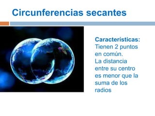 El documento describe las características de diferentes tipos de circunferencias y tangentes, incluyendo circunferencias secantes que comparten dos puntos, circunferencias exteriores que no comparten puntos y tienen centros más distantes que la suma de sus radios, y tangentes exteriores e interiores que comparten un punto y tienen distancias entre centros iguales a la suma o diferencia de los radios.