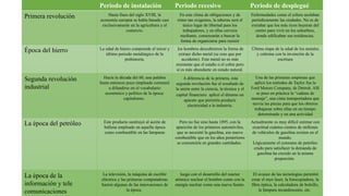 El documento presenta información sobre diferentes períodos históricos y tecnológicos. Aborda el periodo de instalación y la primera revolución industrial hasta fines del siglo XVIII cuando la economía europea se basaba en la agricultura y el comercio. También describe la época del hierro y los metales, la segunda revolución industrial en la década de 1860 impulsada por la ciencia, técnica y capital, y la época del petróleo a partir de 1895. Finalmente, presenta información sobre la época de la información, las nuevas tecn