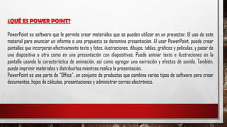 PowerPoint es un software que permite crear presentaciones con texto, imágenes y otros elementos multimedia que pueden ser mostrados en una pantalla. Permite agregar animaciones, efectos de sonido y transiciones entre diapositivas. PowerPoint forma parte de Microsoft Office, un conjunto de programas para crear documentos, hojas de cálculo, presentaciones y correo electrónico.