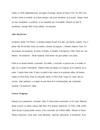 Ulises S. Grant fue un general estadounidense que lideró las fuerzas de la Unión a la victoria en la Guerra Civil. Más tarde se convirtió en el 18o presidente de los Estados Unidos. Como presidente, Grant tuvo éxito en algunas áreas pero su gobierno se vio empañado por escándalos, a pesar de que él mismo era honesto. Grant había tenido una carrera militar distinguida que incluyó victorias clave en Fort Donelson, Vicksburg y Chattanooga.