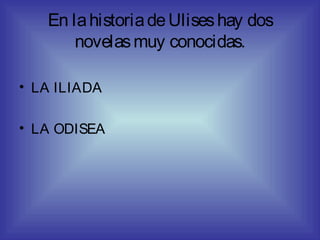 Este documento resume las dos obras épicas más conocidas sobre Ulises: La Ilíada y La Odisea. La Ilíada narra la participación de Ulises en la guerra de Troya, mientras que La Odisea cuenta el largo viaje de regreso de Ulises a su hogar en Ítaca tras la guerra. También proporciona información sobre Ulises, su esposa Penélope y su hijo Telémaco, así como sobre el autor atribuido de ambas obras, Homero.