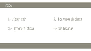 Ulises fue un héroe griego famoso por su papel en la Guerra de Troya y sus largos viajes de regreso a casa después de la guerra. La Odisea de Homero cuenta la historia de sus aventuras, incluidos encuentros con cíclopes, sirenas y otros peligros, así como su regreso final a Ítaca donde derrotó a los pretendientes que cortejaban a su esposa Penélope durante su ausencia.