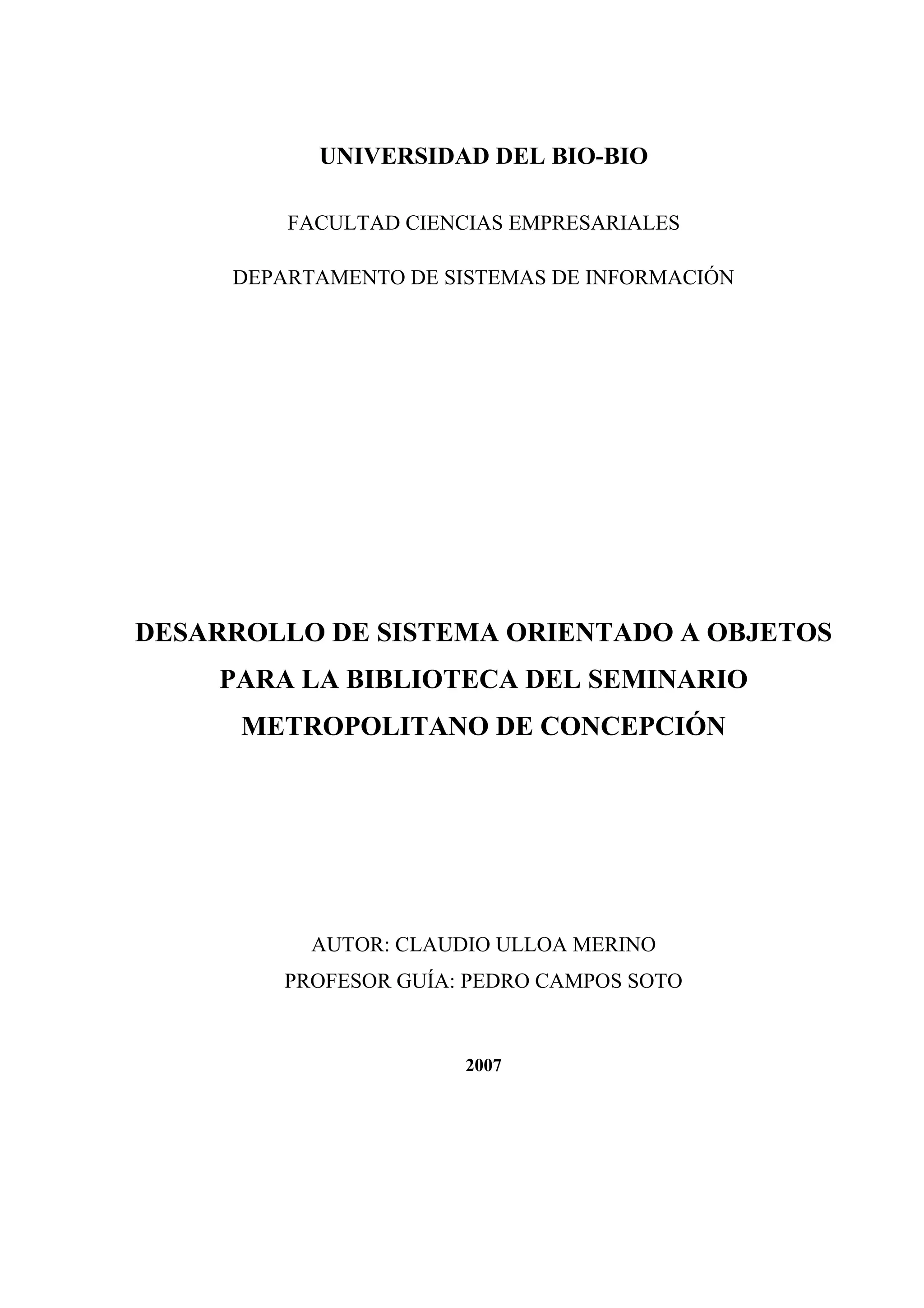 Este documento presenta el desarrollo de un sistema orientado a objetos para la biblioteca del Seminario Metropolitano de Concepción utilizando Java y JSP. El sistema busca automatizar los procesos de registro, préstamo, devolución y búsqueda de materiales para mejorar el funcionamiento de la biblioteca. El documento incluye el análisis y diseño del sistema a través de diagramas UML y la justificación del proyecto mediante un estudio de factibilidad.