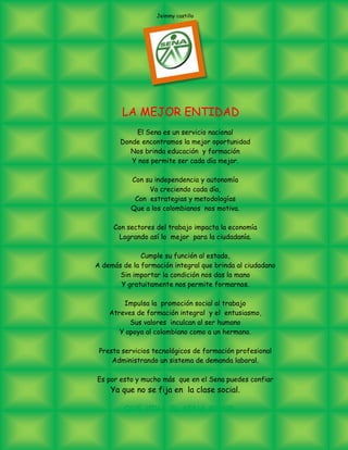 El documento es una oda al Servicio Nacional de Aprendizaje (SENA) de Colombia. Resalta que el SENA brinda oportunidades educativas y de formación gratuitas a los ciudadanos colombianos sin importar su condición social. También destaca que el SENA impulsa el desarrollo social y económico del país a través de la formación profesional y su apoyo al sector laboral. Finalmente, el documento expresa su admiración y apoyo al SENA.
