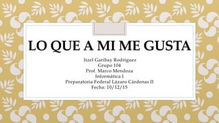 Itzel Garibay Rodríguez comparte sus gustos y experiencias personales a través de una presentación. Expresa su afinidad por el estilo vintage, la creatividad en decoraciones, y su deseo de interactuar pacíficamente con la sociedad. En conclusión, destaca su pasión por la aventura, la realidad y la exploración de su entorno.