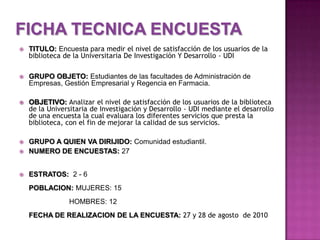 El documento presenta los resultados de una encuesta y entrevistas realizadas a estudiantes de tres facultades de la Universitaria de Investigación y Desarrollo - UDI para medir el nivel de satisfacción de los usuarios de la biblioteca y su hábito lector. Los resultados mostraron que los estudiantes de una de las facultades desconocen los servicios de la biblioteca y que en general los estudiantes tienen bajos hábitos de lectura. Se concluyó que la biblioteca debe mejorar la formación de usuarios, la adquisición de materiales y el ac