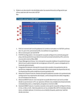 La BIOS SETUP ofrece opciones para configurar parámetros como el dispositivo de arranque, la administración de energía, periféricos integrados, y más. Para instalar un nuevo disco duro como esclavo, se debe colocar el jumper en la posición de esclavo, verificar la configuración del disco maestro existente, y luego ingresar a la BIOS SETUP para reconocer el nuevo dispositivo.