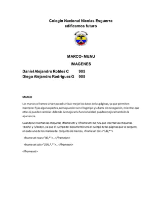 Este documento explica cómo usar marcos (frames) en una página web para distribuir mejor los datos y mantener partes fijas como el logotipo y la barra de navegación. Incluye código HTML para crear una página con marcos que divide la página en dos secciones, un menú de navegación a la izquierda y el contenido principal a la derecha. También muestra cómo crear un menú simple con enlaces e imágenes en una página separada para mostrar en el marco de navegación.