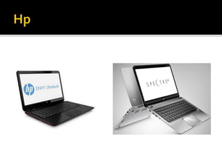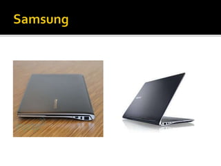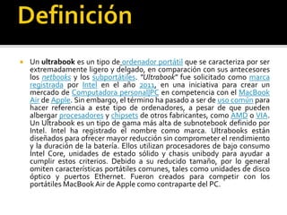 Un ultrabook es un tipo de ordenador portátil definido por Intel que se caracteriza por ser extremadamente ligero, delgado y con un bajo consumo energético. Intel creó el término "ultrabook" en 2011 para competir con el MacBook Air de Apple. Aunque pueden usar procesadores de otros fabricantes, los ultrabooks utilizan procesadores Intel Core de bajo consumo, unidades de estado sólido y chasis unibody. Tienen pantallas no táctiles, omiten unidades ópticas y puertos Ethernet, y ofrecen hasta 8 horas de autonomía.