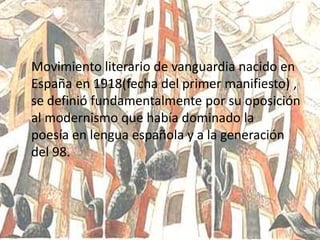El ultraísmo fue un movimiento literario vanguardista nacido en España en 1918, que se caracterizó por su oposición al modernismo y a la poesía narrativa, centrándose en la metáfora y la eliminación de elementos ornamentales en la lírica. Este movimiento se expandió a Argentina, donde incluyó elementos como el criollismo y la parodia, y fue impulsado por poetas como Jorge Luis Borges y Rafael Cansinos-Assens. Aunque su duración fue breve, el ultraísmo marcó un hito en la renovación de la poesía española y sentó las bases para la incorporación de las vanguardias europeas.