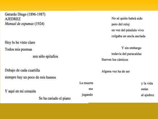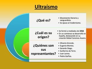 El ultraísmo fue un movimiento literario vanguardista que surgió en España en la década de 1910 como reacción contra el modernismo. Se caracterizó por el uso de metáforas impactantes y la eliminación de elementos retóricos innecesarios. Algunos de sus representantes más destacados fueron Rafael Cansinos Assens, Gerardo Diego y Oliverio Girondo.