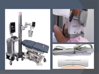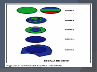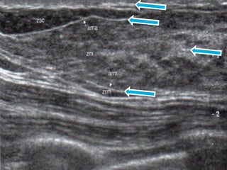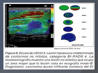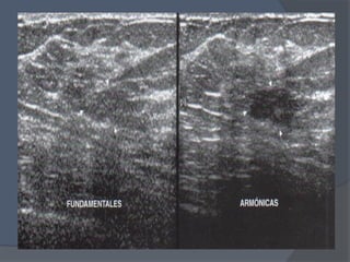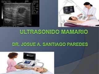 Este documento describe la técnica y aplicaciones del ultrasonido de mama. Explica la anatomía mamaria y cómo se ven sus estructuras en el ultrasonido. Detalla el protocolo para localizar lesiones y documentar hallazgos. Las principales indicaciones son masas palpables, densidades mamográficas y orientación de tejido denso. También resume nuevas tecnologías como el armónico, elastosonografía y ultrasonido automático 3D.