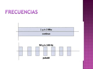 El documento describe el ultrasonido terapéutico. Utiliza ondas sonoras de 800,000 a 3,000,000 Hz producidas por un cabezal vibratorio que aplica energía cinética a los tejidos. Esta energía se absorbe y transforma en el interior del organismo, mejorando procesos como la vasodilatación y el metabolismo celular. El ultrasonido se usa para tratar diversas condiciones musculoesqueléticas y sistémicas.