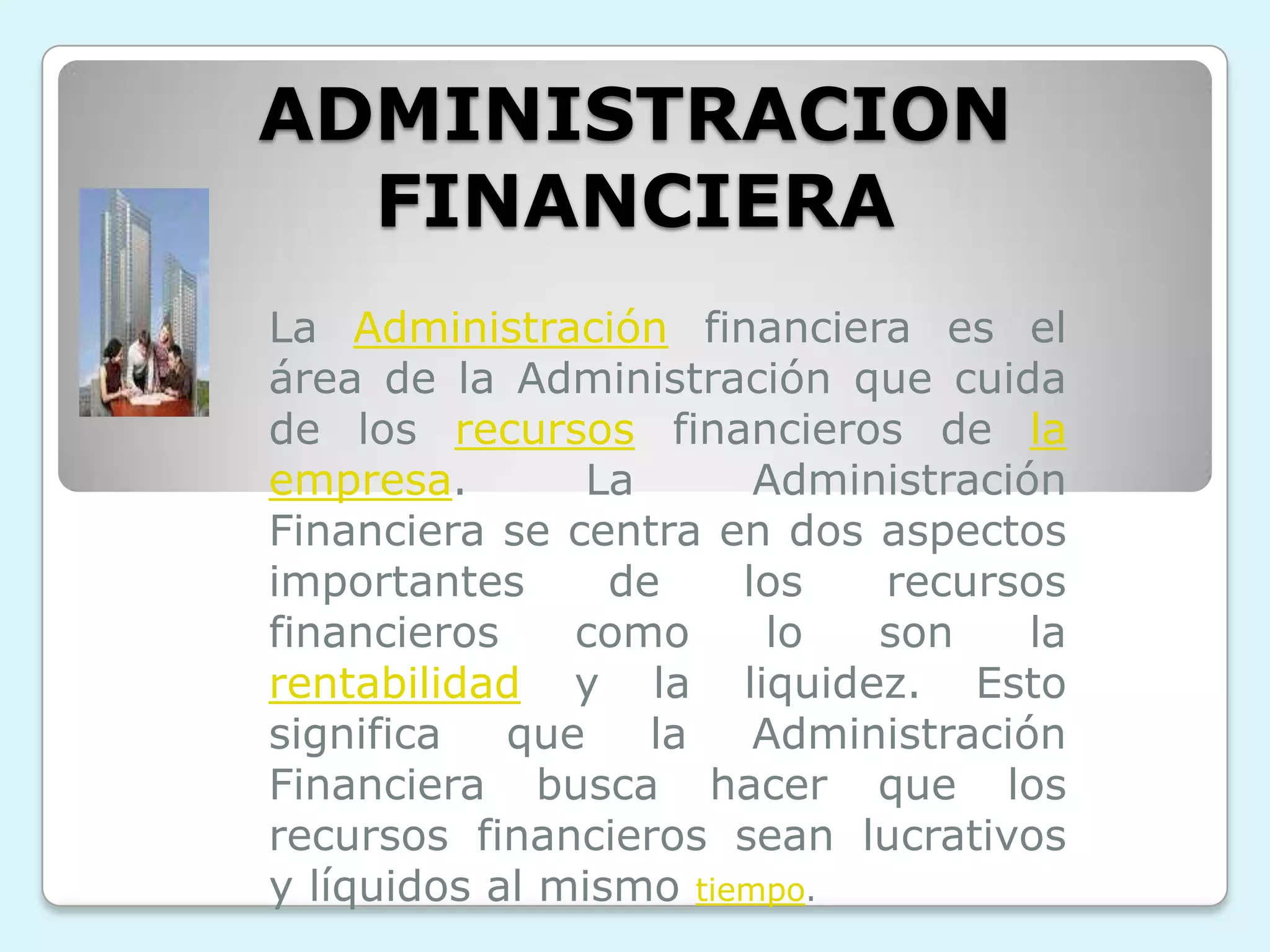 La Administración Financiera se centra en hacer que los recursos financieros de una empresa sean lucrativos y líquidos al mismo tiempo, planeando el crecimiento de la empresa, captando y asignando recursos de manera eficiente, y optimizando los recursos financieros para maximizar las utilidades.