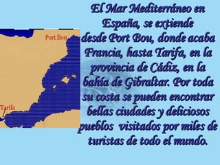 El documento describe las costas del Mar Mediterráneo en España, mencionando numerosas ciudades y pueblos bellos y turísticos que se extienden desde la frontera con Francia hasta el estrecho de Gibraltar, incluyendo las Islas Baleares.