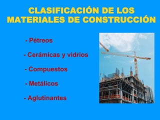Este documento clasifica y describe los principales materiales de construcción como pétreos, cerámicos, compuestos, metálicos y aglutinantes. Luego detalla los cimientos, estructuras, suelos, techos, muros exteriores e interiores de un edificio y los materiales comúnmente usados para cada parte. Finalmente, resume algunas propiedades importantes de los materiales de construcción como su densidad y resistencia a la compresión y tracción.